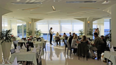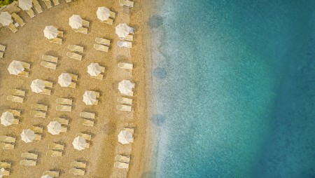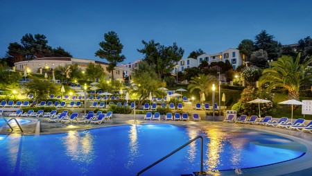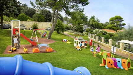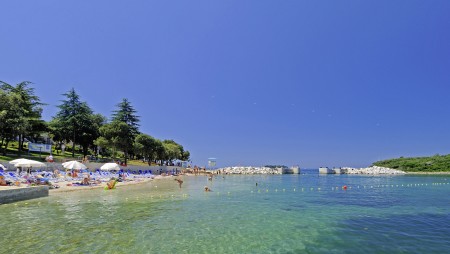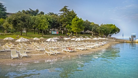 Strand: Zum Fels- und Kiesstrand mit Liegeflächen und Duschen, der teilweise flach abfällt, sind es je nach Unterbringung etwa 30 bis 200 m über Treppen und Wege. Ein kleiner Teil wurde flachabfallend mit Kies angelegt. Sonnenschirme und Liegestühle gegen Gebühr.