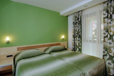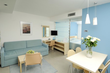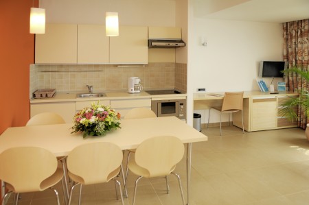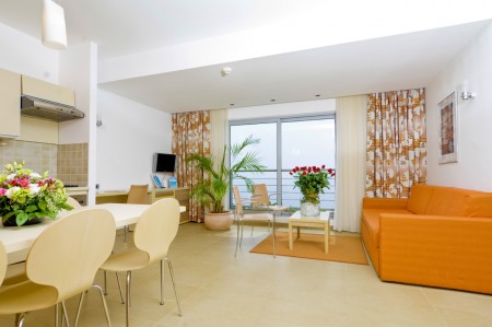 Appartement für 2-4 Personen: ca. 45-50 m², Schlafzimmer mit zwei Einzelbetten (je 100x200 cm), Wohnraum mit Schlafsofa (160x190-200 cm), Klimaanlage, SAT-TV, Telefon, WiFi-Internet (kostenlos), Safe, Kochnische mit Mikrowelle und Kaffeemaschine, Essecke, Dusche/WC, Balkon.
