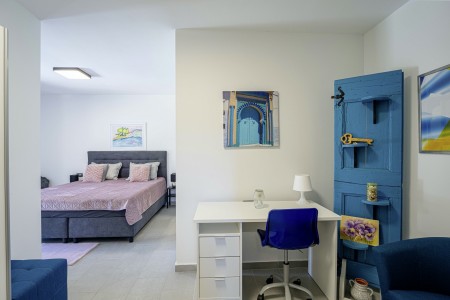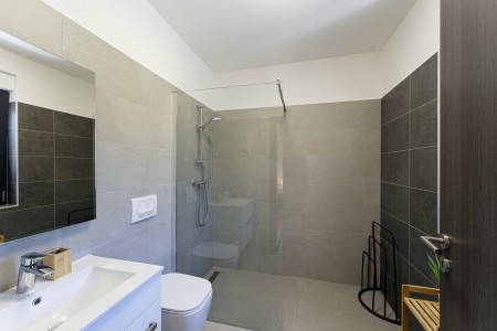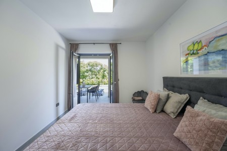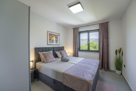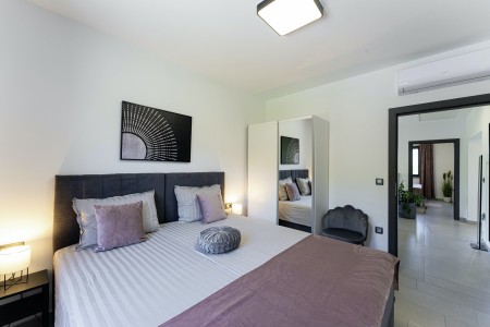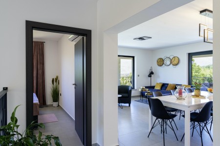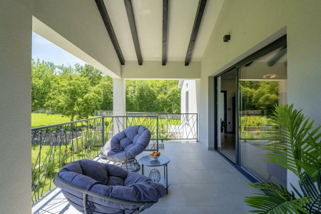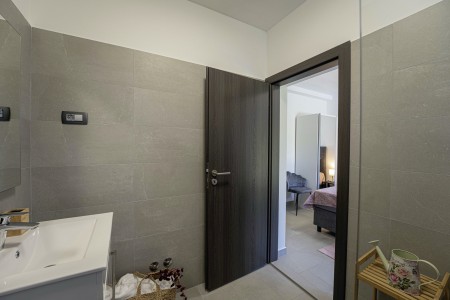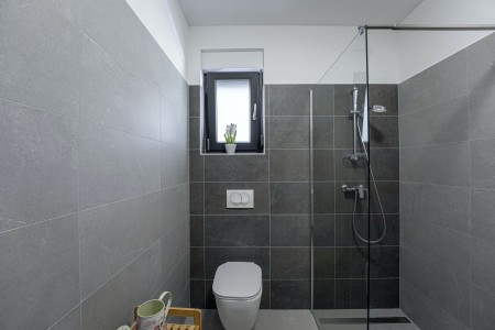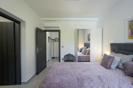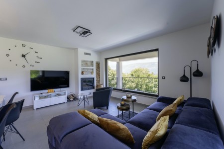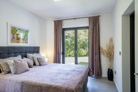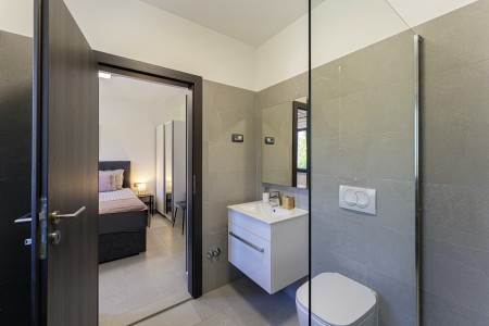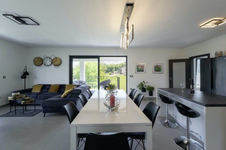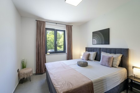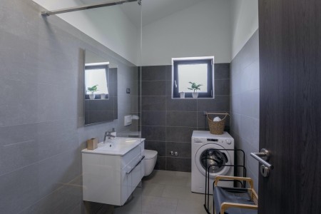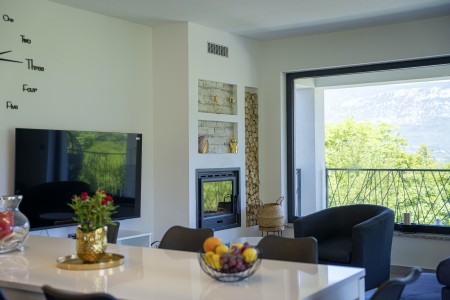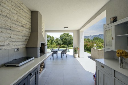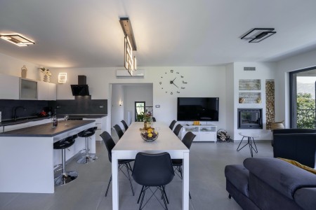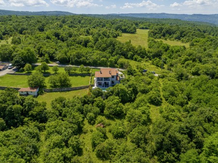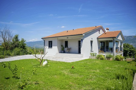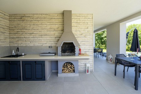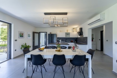 Die moderne, völlig freistehende Villa liegt in Blaškovići, einem sehr ruhigen Dorf, das zur Gemeinde Kršan gehört. Umgeben von viel Grün und einer einmalig schönen Landschaft mit weitläufigen Feldern, Wiesen und Wäldern, lässt es sich hier wunderbar in Ruhe entspannen. Neben einem privaten Swimmingpool (4 x 8 m) mit Sonnenterrasse und Liegestühlen bietet der gepflegte Außenbereich eine komplett ausgestattete Sommerküche mit Grillkamin und überdachtem Essbereich im Freien. Die kleinen Gäste dürfen sich auf einen eigenen kleinen Spielplatz mit Schaukel und Rutsche freuen. Das hochwertig eingerichtete Haus bietet neben allen erdenklichen Annehmlichkeiten einen einmalig schönen Blick auf den Berg Učka und seinen höchsten Gipfel Vojak. Die Umgebung eignet sich ideal für ausgedehnte Radtouren und Wanderungen durch die immergrüne Natur, und wer den Berg Učka erklimmt, wird mit einem atemberaubenden Ausblick belohnt. Und auch für einen Badeurlaub sind Sie hier bestens aufgehoben, denn der Strand „Copacabana“, unterhalb des historischen Städtchens Plomin gelegen, ist nur 7 km entfernt. Die bekannteren Strände in Rabac sind ca. 20 km entfernt. Restaurant und Einkaufsmöglichkeit befinden sich in Kršan (2 km). Die beste Pizzeria der Gegend finden Sie in der sehenswerten Altstadt der Hügelstadt Labin (12 km).