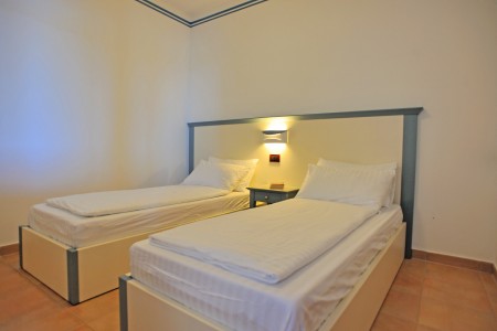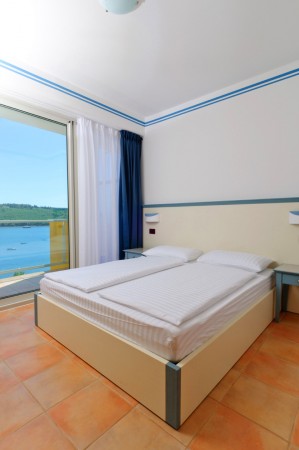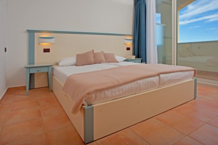 Appartement Typ E für 4-6 Personen: ca. 50 m², ein Schlafzimmer mit Doppelbett, ein Schlafzimmer mit zwei Einzel- oder Etagenbetten, Wohn-Schlafraum mit Doppel-Schlafcouch, Küchenzeile, Essecke, Klimaanlage, SAT-TV, Safe, WiFi-Internet (kostenlos), zwei Duschen/WC, Balkon oder Terrasse mit Meerblick.