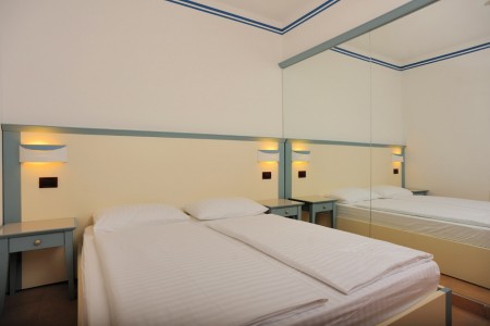 Appartement Typ D für 4-6 Personen: ca. 45 m², Eingangsbereich mit Doppelbett oder Etagenbett, ein Schlafzimmer mit Doppelbett, Wohn-Schlafraum mit Doppel-Schlafcouch, Küchenzeile, Essecke, Klimaanlage, SAT-TV, Safe, WiFi-Internet (kostenlos), Dusche/WC, Balkon oder Terrasse. Wahlweise auch buchbar mit Meerblick.