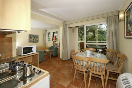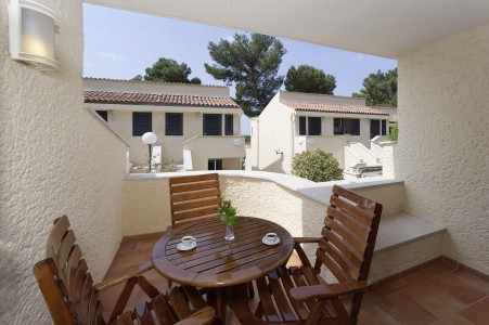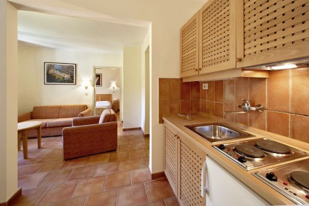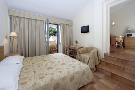Appartement für 4-5 Personen Typ 1: modern eingerichtet, ca. 35-44 m², zwei Doppelzimmer, Wohn-Schlafraum mit Schlafcouch, Klimaanlage, SAT-TV, Telefon, WiFi-Internet (kostenlos), Safe gegen Gebühr, Küchenzeile mit Mikrowellenherd und Essecke, Dusche/WC, Balkon oder Terrasse. Babybett auf Anfrage kostenlos möglich.