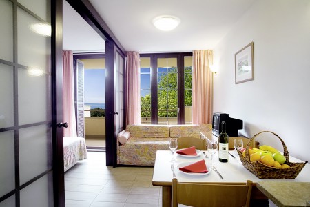 Appartement Standard für 2-4 Personen: ca. 44 m², ein Doppelzimmer, Wohnraum mit zwei Schlafgelegenheiten, SAT-TV, Kochnische (durch Regal vom Wohnbereich abgeteilt) und Essecke, Dusche/WC, Balkon zur Meerseite.