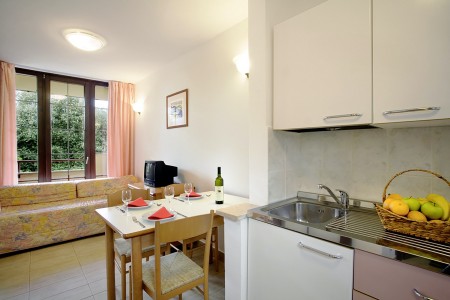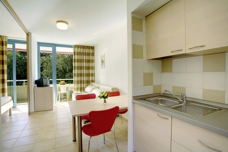 Appartement Standard für 3 Personen: ca. 38 m², ein kleineres Doppelzimmer, Wohn-Schlafraum mit Schlafcouch, SAT-TV, Kochnische und Essecke, Dusche/WC, Balkon zur Meerseite.