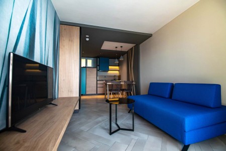 Appartement Typ B für 2-3 Personen: ca. 29 m², ein Doppelzimmer, Wohn-Schlafraum mit Schlafsofa, Küchenzeile mit Mikrowelle, Kaffeemaschine und Kühlschrank, Essecke, Klimaanlage, Safe, Telefon, WiFi-Internet (kostenlos), LCD SAT-TV, Dusche/WC, Balkon zur Parkseite.