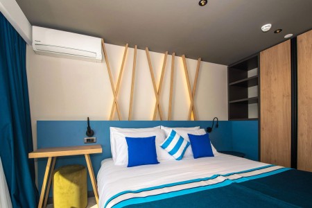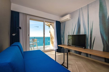 Appartement Typ B für 2-4 Personen: ca. 35 m², ein Doppelzimmer, Wohn-Schlafraum mit Doppel-Schlafsofa, Küchenzeile mit Mikrowelle, Kaffeemaschine und Kühlschrank, Essecke, Klimaanlage, Safe, Telefon, WiFi-Internet (kostenlos), LCD SAT-TV, Dusche/WC, Balkon. Wahlweise buchbar zur Parkseite oder zur Meerseite.