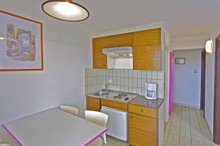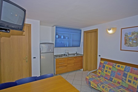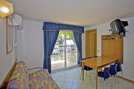 Appartement Typ BX für 2-4 Personen: ca. 35-40 m², ein Schlafzimmer mit zwei Einzelbetten (je 80x190 cm), Wohn-Schlafraum mit Schlafsofa (140x190 cm), Küchenzeile und Essecke, Dusche/WC, Balkon, teilweise zur Meerseite.