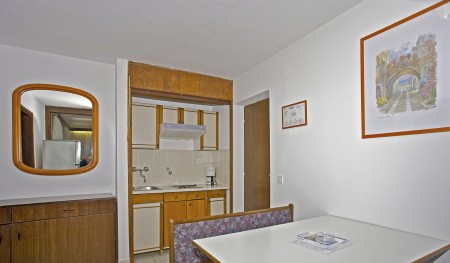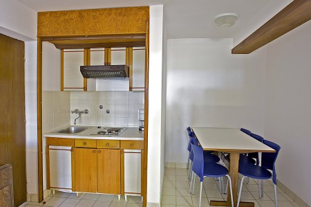 Appartement Typ B für 2-3 Personen: ca. 19-30 m², Wohn-Schlafraum mit zwei Betten oder ein Schlafzimmer und ein Wohnraum mit Schlafgelegenheit für eine Person, Küchenzeile, Dusche/WC, Balkon.