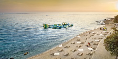 Strand: Zum 1 km langen, mit der Blauen Flagge ausgezeichneten Felsstrand mit Sonnenschirmen und Liegestühlen (kostenlos, begrenzte Anzahl) sind es je nach Unterbringung etwa 100 bis 350 m.