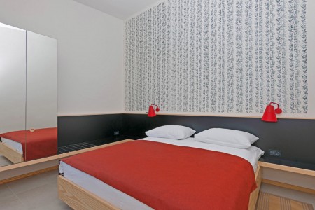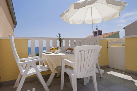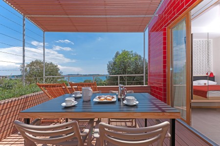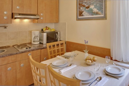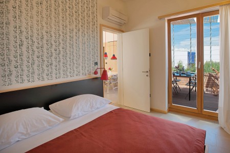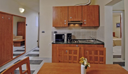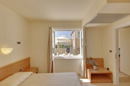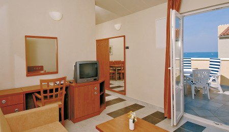 Appartement für 3-4 Personen (Premium): ca. 40-45 m², ein Schlafzimmer mit Doppelbett (180x200 cm), Wohn-Schlafraum mit Schlafcouch (140x210 cm) für zwei kleinere Kinder oder eine erwachsene Person, Küchenzeile mit Mikrowelle, Backofen, Kaffeemaschine und Spülmaschine, Essecke, Klimaanlage, SAT-TV, Telefon, Safe, Dusche/WC, Terrasse.