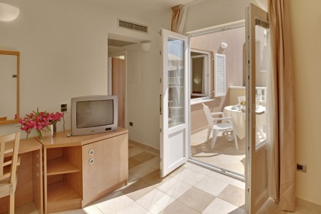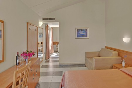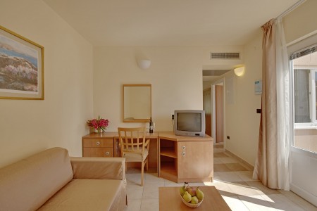 Appartement für 2-4 Personen (Standard): ca. 30-36 m², ein Schlafzimmer mit Einzelbetten (je 90x200 cm), Wohn-Schlafraum mit Doppel-Schlafcouch (190x200 cm), Küchenzeile mit Mikrowelle und Kaffeemaschine, Essecke, Klimaanlage, SAT-TV, Telefon, Safe, Dusche/WC, Terrasse.
