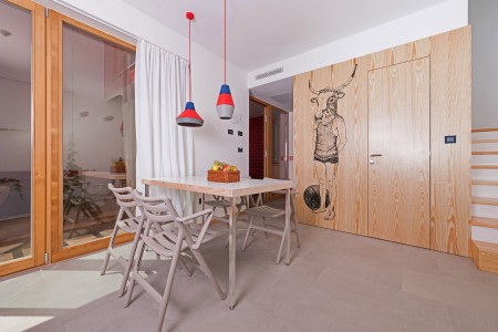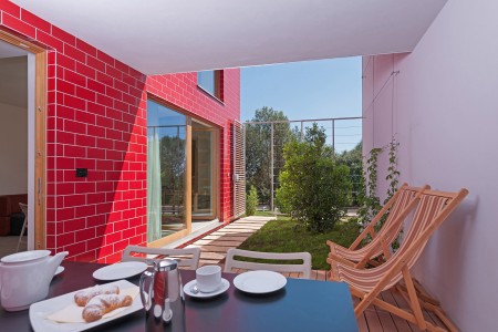 Appartement für 4-6 Personen (Premium): ca. 66 m² auf zwei Ebenen. Oben zwei Doppelzimmer – davon eines mit Doppelbett (180x200 cm) mit zwei Einzelbetten (je 90x200 cm), Dusche/WC. Im unteren Bereich Wohn-Schlafraum mit Schlafcouch (140x210 cm) für zwei kleinere Kinder oder eine erwachsene Person, Küchenzeile mit Mikrowelle, Backofen, Kaffeemaschine und Spülmaschine, Essecke, Klimaanlage, SAT-TV, Telefon, Safe, WC, überdachte Terrasse (ca. 29 m²).