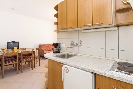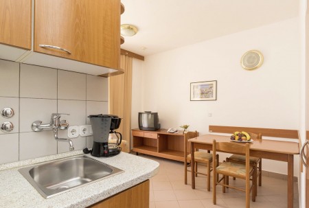 Appartement für 2-3 Personen: ca. 30 m², Doppelzimmer mit zwei Einzelbetten, Wohn-Schlafraum mit Schlafcouch, SAT-TV, Telefon, Kochnische und Essecke, Bad/WC und Balkon oder Terrasse.