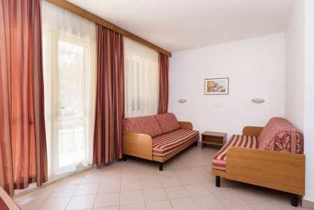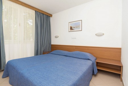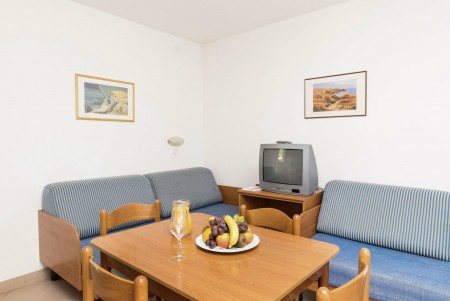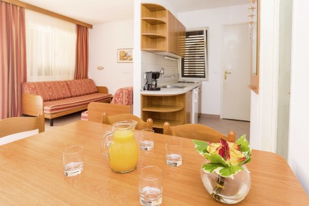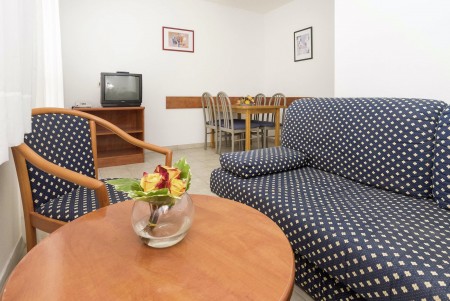 Appartement für 2-4 Personen: ca. 30 m², Doppelzimmer mit zwei Einzelbetten, Wohn-Schlafraum mit Doppel-Schlafcouch, SAT-TV, Telefon, Kochnische und Essecke, Bad/WC und Balkon oder Terrasse.