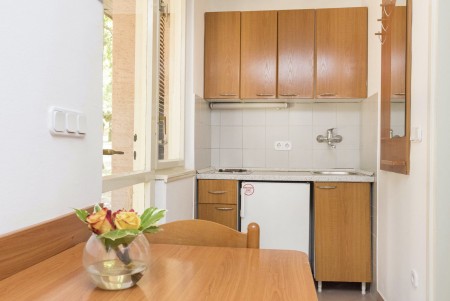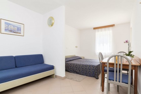Studio für 2-3 Personen: ca. 27 m², Wohn-Schlafraum mit Doppelbett oder zwei Einzelbetten und Schlafcouch, SAT-TV, Telefon, Kochnische und Essecke, Bad/WC und Balkon oder Terrasse.