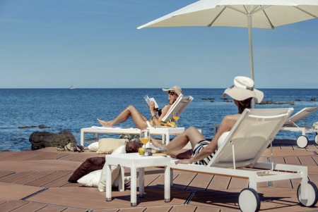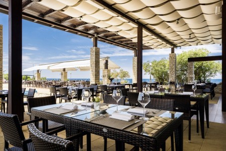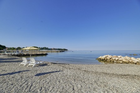 Strand: Der neu angelegte Fels- und Kiesstrand mit Liegeflächen verläuft um die gesamte Halbinsel. Liegen und Sonnenschirme dort gegen Gebühr.