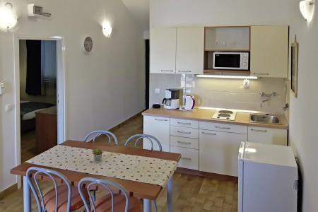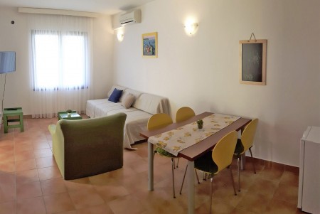 Appartement für 2-4 Personen: ca. 33 m² im Erdgeschoss, ein Doppelzimmer, Wohnraum mit Schlafcouch oder Zustellbett und Schlafsofa, SAT-TV, Klimaanlage, Küchenzeile und Essecke, Dusche/WC, Terrasse mit Sitzgarnitur.