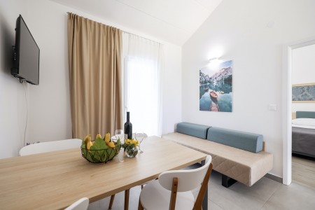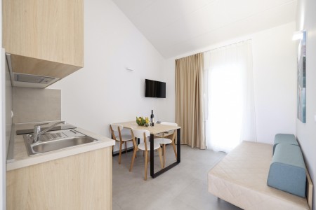 Appartement "Superior A" für 2-3 Personen: ca. 42 m², Schlafzimmer mit zwei Einzelbetten, Wohnbereich mit kleiner Küche (Kühlschrank, Elektroherd, Spüle, Mikrowelle, Kaffeemaschine und Wasserkocher), Essbereich, Schlafsofa für 1 Kind bis 11,99 Jahren (200 x 160 cm), Badezimmer mit Dusche/WC, Föhn, Klimaanlage, SAT-TV, Safe, Telefon und WiFi (kostenlos). Möblierter Balkon mit Blick auf den Pinienwald. Die Appartements Superior A befinden sich im Erdgeschoß und verfügen über eine möblierte Terrasse. Auch zur Meerseite buchbar.
