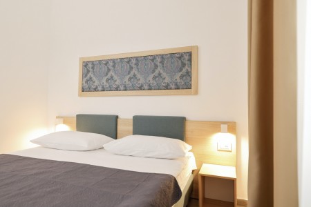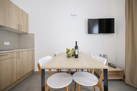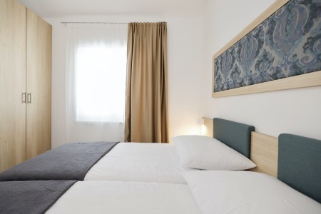 Appartement "Superior B" für 4-5 Personen: ca. 46 m², zwei Schlafzimmer mit zwei Einzelbetten, Wohnbereich mit kleiner Küche (Kühlschrank, Elektroherd, Spüle, Mikrowelle, Kaffeemaschine und Wasserkocher), Essbereich, Schlafsofa für 1 Kind bis 11,99 Jahren (180 x 80 cm), Badezimmer mit Dusche/WC, Föhn, Klimaanlage, SAT-TV, Safe, Telefon und WiFi (kostenlos). Möblierter Balkon mit Blick auf den Pinienwald. Die Appartements Superior B befinden sich im 1. Stock und verfügen über einen möblierten Balkon. Auch zur Meerseite buchbar.