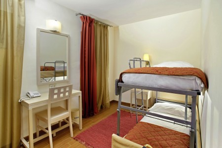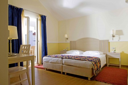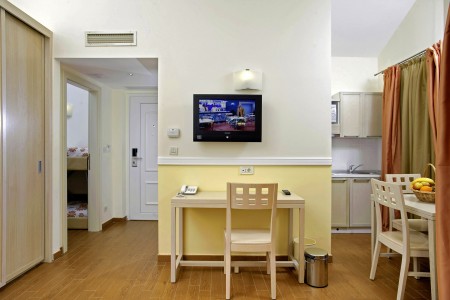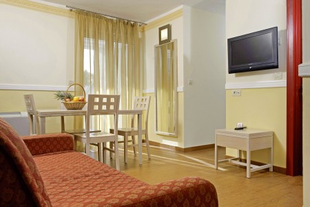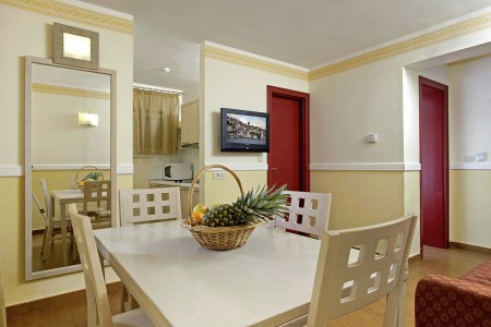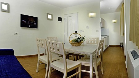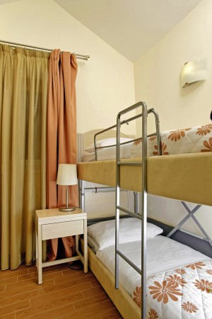 Appartement für 3-5 Personen: ca. 55 m², zwei Doppelzimmer (davon eines mit Einzel- oder Etagenbetten für zwei Kinder bis 12 Jahre), Wohn-Schlafraum mit Schlafgelegenheit, Küchenzeile und Essecke, Telefon, SAT-TV, Klimaanlage, Dusche/WC, separates WC und zwei Balkone. Belegung mit max. 3 Erwachsenen + 2 Kindern bis 12 Jahre.