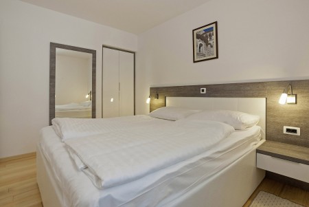 Appartement für 2-4 Personen Typ B: ca. 45 m², in der ersten Etage gelegen, bestehend aus Wohnzimmer mit Schlafsofa, Küchenzeile (Herd mit 4 Kochfeldern, Backofen, Kühlschrank, Kaffeemaschine) und Essbereich, ein Schlafzimmer mit Doppelbett, ein Schlafzimmer mit ausziehbarem Schlafsofa, SAT-TV, Klimaanlage, Telefon, WiFi-Internet (kostenlos), Safe, Dusche/WC mit Haarföhn, Balkon.
