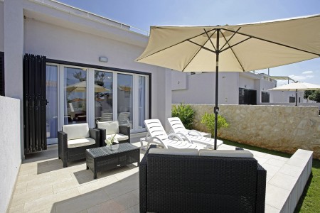 Appartement für 2-5 Personen Typ E: ca. 70 m², im Erdgeschoss, bestehend aus Wohnzimmer mit Schlafsofa, Küchenzeile (Herd mit 4 Kochfeldern, Backofen, Kühlschrank, Kaffeemaschine) und Essbereich, ein Schlafzimmer mit Doppelbett, ein Schlafzimmer mit ausziehbarem Schlafsofa, SAT-TV, Klimaanlage, Telefon, WiFi-Internet (kostenlos), Safe, Dusche/WC mit Haarföhn, Terrasse.