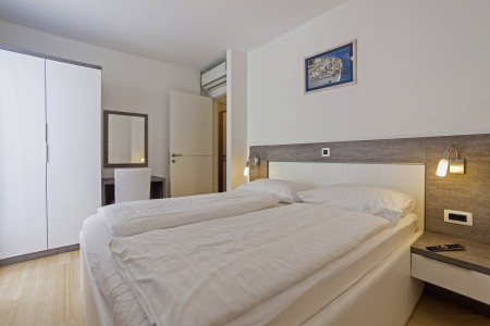 Appartement für 2-5 Personen Typ D: ca. 65 m², im Erdgeschoss oder in der ersten Etage gelegen, bestehend aus Wohnzimmer mit Schlafsofa, Küchenzeile (Herd mit 4 Kochfeldern, Backofen, Kühlschrank, Kaffeemaschine) und Essbereich, ein Schlafzimmer mit Doppelbett, ein Schlafzimmer mit ausziehbarem Schlafsofa, SAT-TV, Klimaanlage, Telefon, WiFi-Internet (kostenlos), Safe, Bad/WC mit Haarföhn, Balkon oder Terrasse.