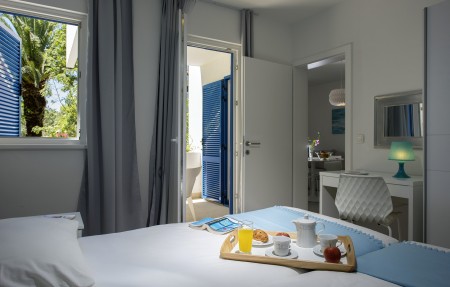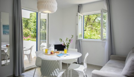 Appartement für 4-6 Personen: ca. 57 m², renoviert und modern eingerichtet, zwei Doppelzimmer, Wohn-Schlafraum mit Mini-Küche, Essecke und Schlafsofa, Klimaanlage, SAT-TV, Telefon, WiFi-Internet (kostenlos), Dusche/WC, separates WC, Terrasse oder Balkon.