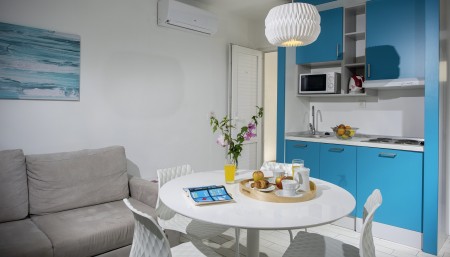 Appartement für 3-5 Personen: ca. 40 m², renoviert und modern eingerichtet, ein Doppelzimmer mit zwei Einzelbetten und zusätzlichem Schlafsofa, Wohn-Schlafraum mit Mini-Küche, Essecke und Schlafsofa, Klimaanlage, SAT-TV, Telefon, WiFi-Internet (kostenlos), Dusche/WC, Terrasse oder Balkon.