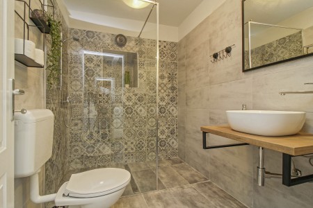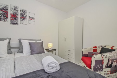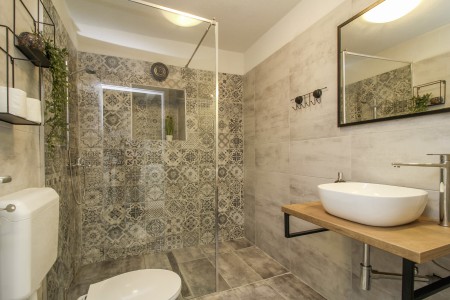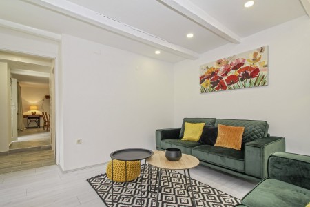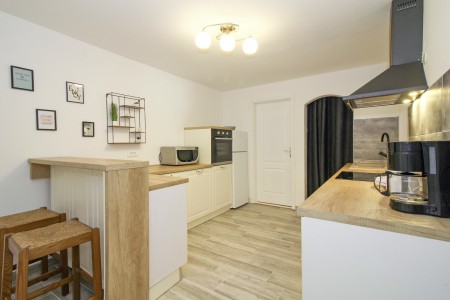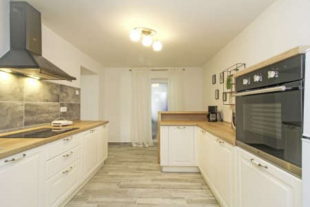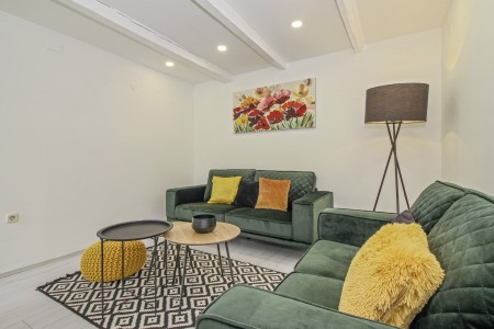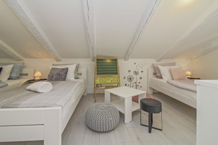Haus für 4-5 Personen: ca. 100 m² auf zwei Etagen. Im Erdgeschoss befinden sich eine moderne, komplett ausgestattete Küche, ein separates Esszimmer, ein Wohnzimmer mit bequemer Couchgarnitur und zwei Badezimmer mit Dusche und WC. Im ersten Stock befinden sich zwei Schlafzimmer – eines mit drei Einzelbetten und ein Schlafzimmer mit Doppelbett. Die Klimaanlage befindet sich im Treppenbereich.