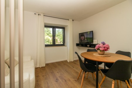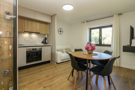 Haus für 2-3 Personen: ca. 44 m², ebenerdig. Ein Schlafzimmer mit Doppelbett, ausziehbarer Schlafcouch für eine Person und Klimaanlage. Gemütlich eingerichtete Wohnküche mit Esstisch und Couch, ein Badezimmer mit Dusche und WC. Im Hof gibt es eine überdachte Terrasse mit Essbereich im Freien. Auf der Rückseite des Hauses erwartet Sie eine große offene Terrasse (ca. 25 m²) mit Grillkamin, Liegestühlen und atemberaubendem Ausblick auf die herrliche Landschaft.