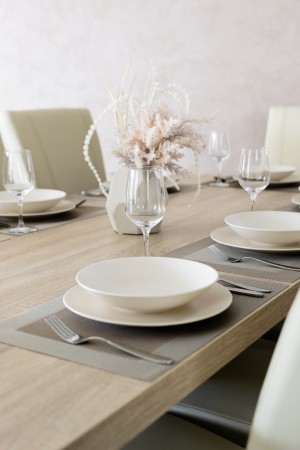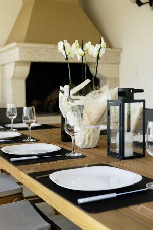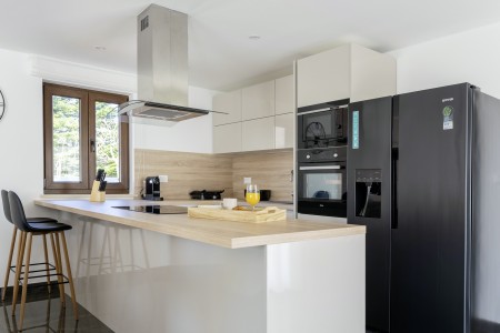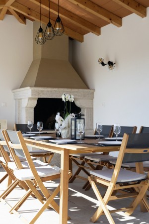 Haus für 8 Personen: ca. 165 m² auf zwei Etagen. Im Erdgeschoss befindet sich der geräumige, elegant eingerichtete Wohn-/Essbereich mit Klimaanlage, elektrischem Kamin, bequemer Couch und komplett ausgestatteter Küche. Des Weiteren bietet das Erdgeschoss ein Schlafzimmer mit Doppelbett, Klimaanlage, TV und eigenem Badezimmer mit Dusche und WC. Ein separates WC befindet sich auf dem Flur. In der ersten Etage befinden sich ein Schlafzimmer mit Doppelbett und eigenem Badezimmer mit Dusche und WC, zwei weitere Schlafzimmer mit Doppelbett und gemeinsamem Balkon, sowie ein Badezimmer mit Dusche und WC. Alle Schlafzimmer sind mit TV und Klimaanlage ausgestattet.