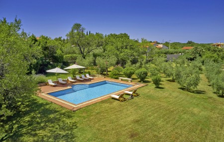 Das Dorf Kavran liegt auf einem Hügel nahe der Ostküste Istriens, etwa 3000 m über Feldwege von Wildstränden entfernt. Hier befindet sich die Villa Arbora, von der sich ein herrlicher Ausblick auf die Kvarner Bucht und das Učka-Gebirge bietet. Das von den Gastgebern, einem Architekten-Ehepaar, komfortabel und geschmackvoll eingerichtete Haus bietet Ihnen nicht nur 230 m² Wohnfläche, sondern zusätzlich 100 m² überdachte und offene Terrassen, die nahtlos in den von Natursteinmauern eingegrenzten Garten übergehen.