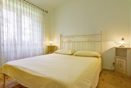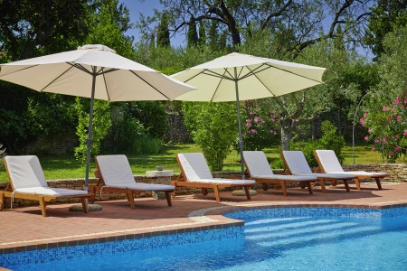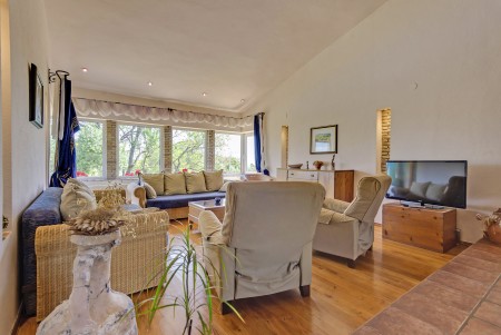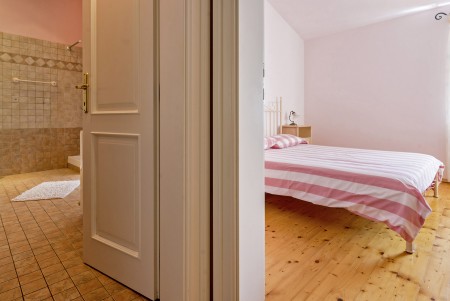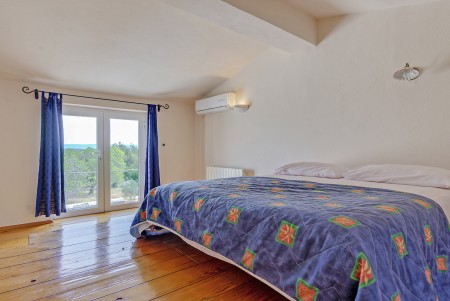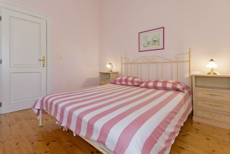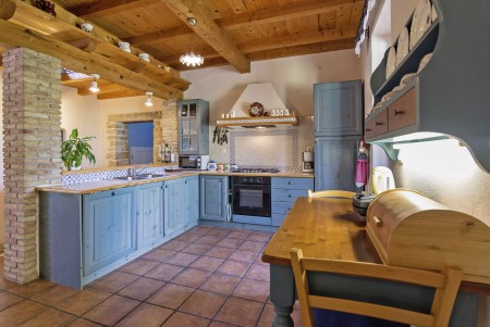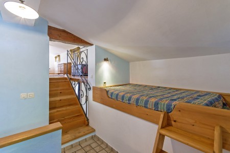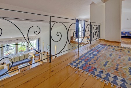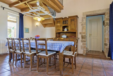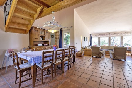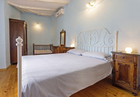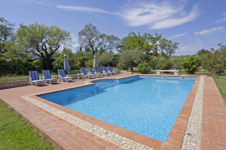 Haus für 10 Personen: ca. 230 m², im Erdgeschoss befinden sich ein Schlafzimmer mit Doppelbett und Klimaanlage, zwei Schlafzimmer mit Doppelbett und ein Schlafzimmer mit Doppelbett und Klimaanlage, das über einen separatem Eingang von außen zu erreichen ist. Des Weiteren gibt es vier Badezimmer mit Dusche und WC sowie einen klimatisierten Wohnraum mit offenem Kamin und Galerie, auf der sich zwei weitere Schlafgelegenheiten befinden. Der Wohnraum geht über in die rustikale Küche und den Essbereich. Swimmingpool (11 x 6 m).