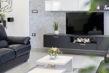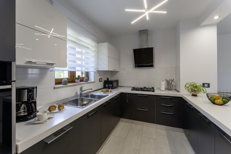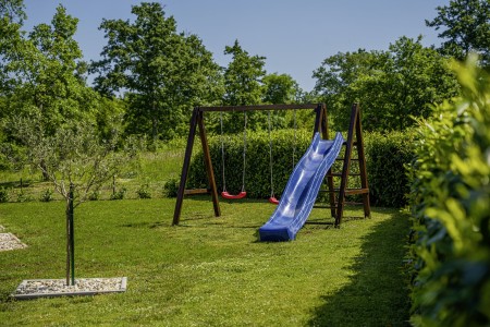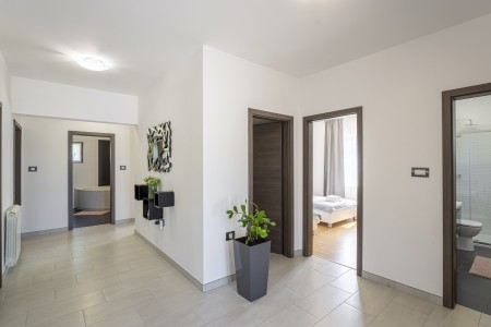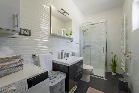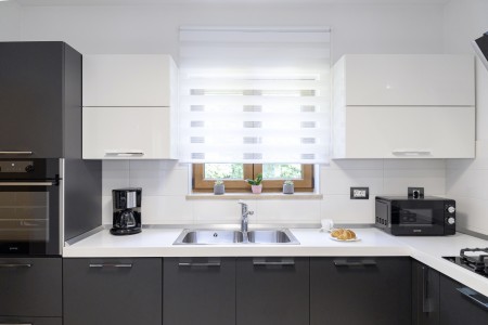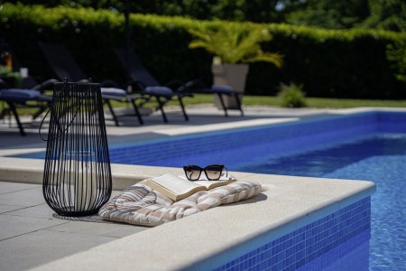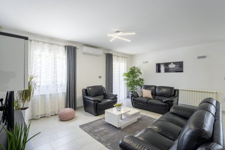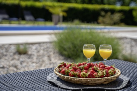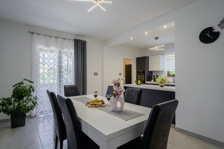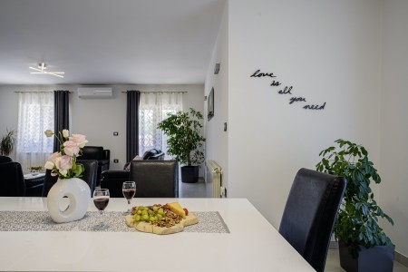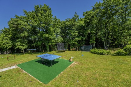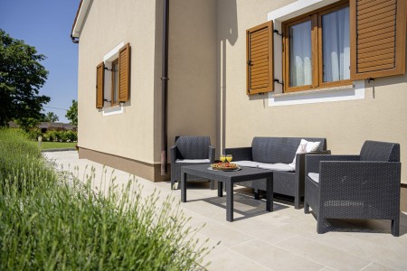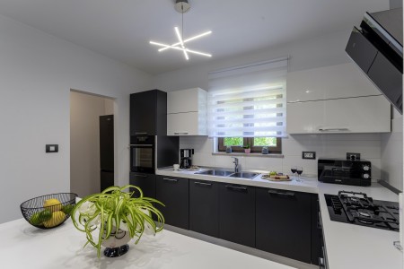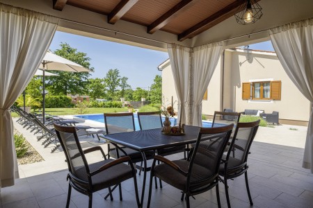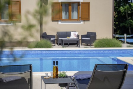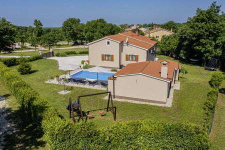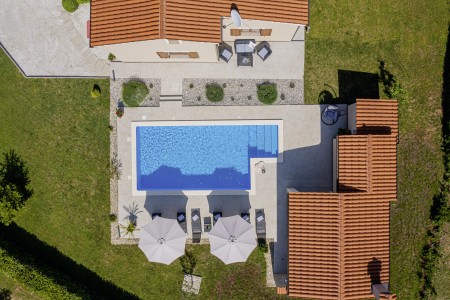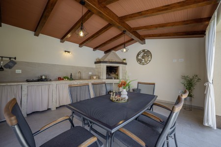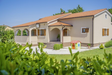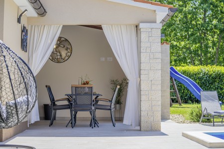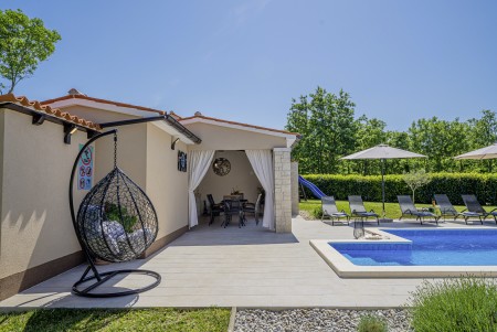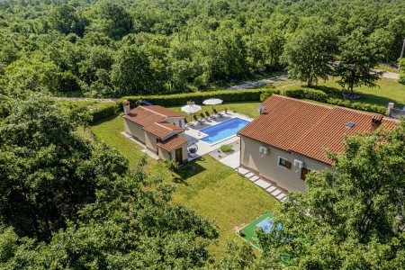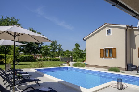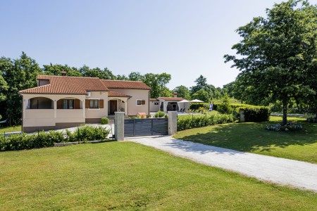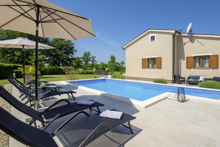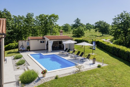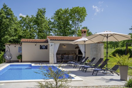 Die freistehende Villa liegt etwas außerhalb des Dorfes Cukrići auf einem 1600 m² großen, komplett eingezäunten Grundstück, das Ruhe und Privatsphäre garantiert. Umgeben von viel Grün und einer einmalig schönen Landschaft bietet diese Villa die besten Voraussetzungen für einen erholsamen Aufenthalt, sei es mit Freunden oder Familie. Der gepflegte Außenbereich erwartet Sie mit einem Garten, privatem Pool (8 x 4 m), Sommerküche mit Grill und überdachtem Essbereich im Freien. Das modern eingerichtete Interieur der Villa ist einladend gestaltet und bietet neben einem großen Wohn-/Essbereich drei komfortable Schlafzimmer und zwei Badezimmer. Der kleine Ort Cukrići ist ca. 10-15 Autominuten von der Küste entfernt, die nächstgelegenen Strände befinden sich bei Bale. Im ca. 8 km entfernten Ort Svetvinčenat finden Sie nicht nur Restaurant, Café-Bars, Pizzeria und Einkaufsmöglichkeiten, sondern auch ein spannendes Ausflugsziel für Groß und Klein. Den Mittelpunkt des Ortes bildet das historische Kastell Morosini-Grimani, das im Sommer Schauplatz zahlreicher Veranstaltungen mit Musik und verschiedenen Vorführungen ist. Darüber hinaus können mehrere Ausstellungen besucht werden und es wird sogar ein Escape-Game-Abenteuer angeboten.