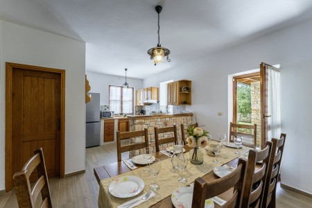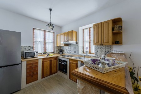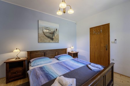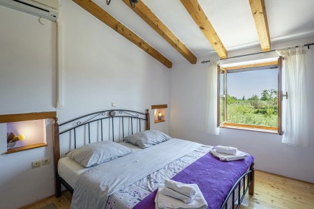 Haus für 7 Personen: ca. 220 m², auf zwei Etagen. Im Erdgeschoss befinden sich eine Küche mit Essbereich, ein Wohnzimmer mit Kamin und Couch, eine Abstellkammer, ein Badezimmer mit Dusche und WC sowie ein Schlafzimmer mit Doppelbett. Zwei große überdachte Terrassen, eine davon mit Kamin und Sommerküche mit Waschbecken. In der ersten Etage gibt es zwei Schlafzimmer – eines mit Doppelbett und Einzelbett, das andere mit Doppelbett. Außerdem ein Badezimmer mit Dusche und WC. Alle Schlafzimmer sind mit SAT-TV und Klimaanlage ausgestattet.
