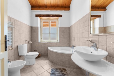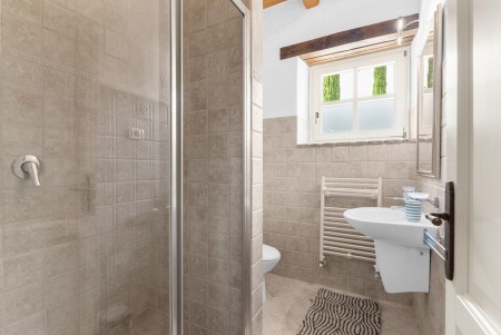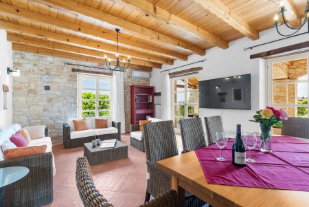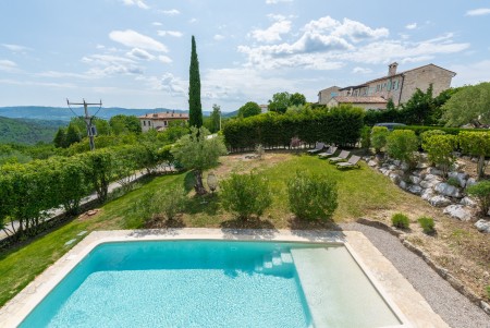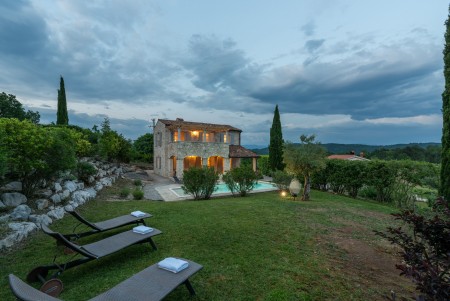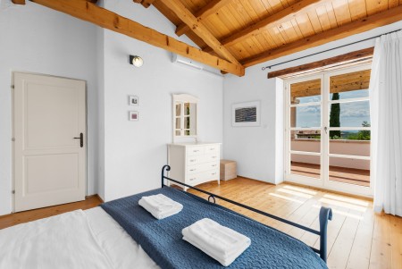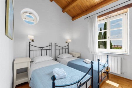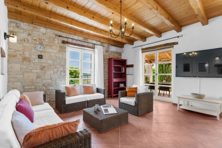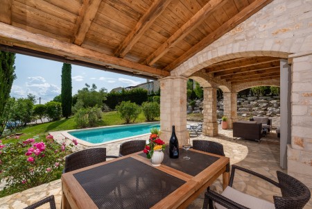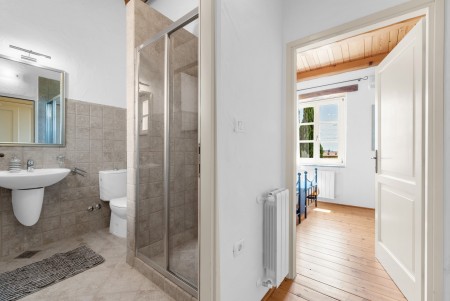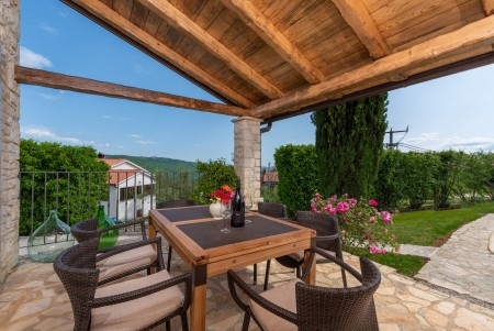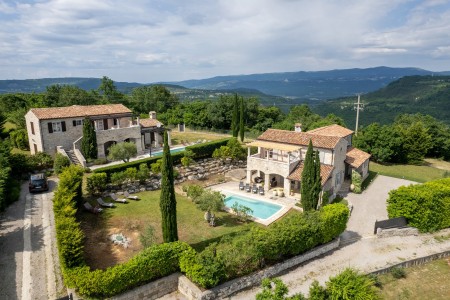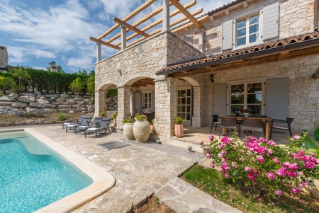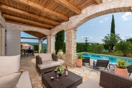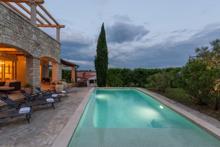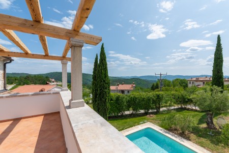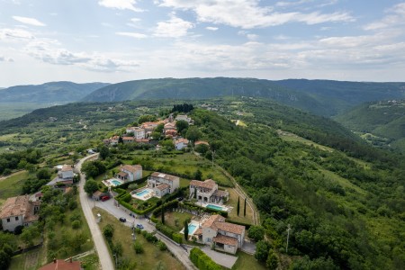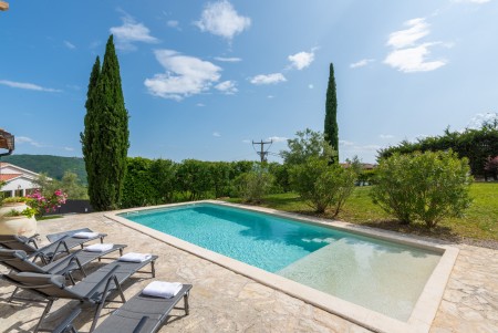 Diese moderne, zweistöckige Villa in Sovinjak vereint modernes Design und mediterranes Flair. Mit vier großzügigen Schlafzimmern und vier Badezimmern bietet das Haus reichlich Platz für bis zu acht Gäste. Der offene Wohn- und Essbereich ist hell und einladend, mit einer komplett ausgestatteten Küche, die keine Wünsche offenlässt – ideal für gesellige Abende oder ein entspanntes Frühstück mit Blick auf den Pool. Draußen erwartet Sie ein privater Swimmingpool (4 x 8 m) mit einer Sonnenterrasse, auf der Liegestühle zum Relaxen einladen. Die überdachte Terrasse mit Sitzmöbeln bietet den perfekten Platz für ein Abendessen im Freien oder ein Glas Wein unter dem Sternenhimmel. Die Villa befindet sich in Sovinjak, einem kleinen Dorf in der Nähe von Buzet, der Trüffelhauptstadt Kroatiens und Heimat des kroatischen Automobilsports. Hier eröffnet sich Ihnen eine Welt aus Natur und Genuss: entdecken Sie die Umgebung bei Wanderungen oder Fahrradtouren durch die immergrüne Landschaft, oder erklimmen Sie den nahegelegenen Berg Učka, um einen unvergesslichen Panoramablick zu erleben. Eine typisch istrianische Taverne erreichen Sie bequem in 300 Metern, und alles Weitere für den täglichen Bedarf finden Sie im ca. 7,4 km entfernten Buzet.