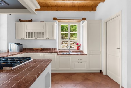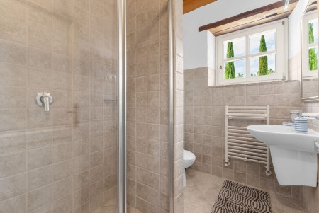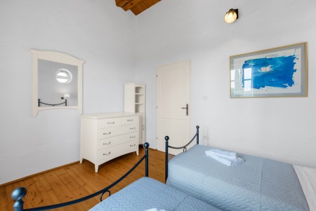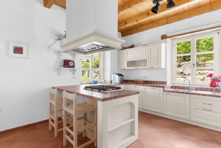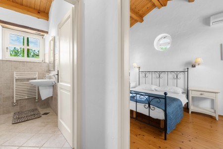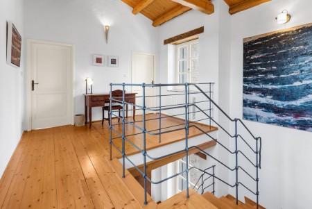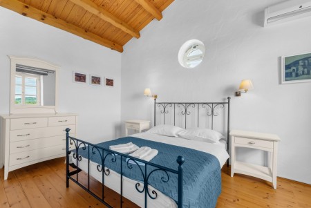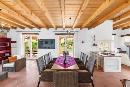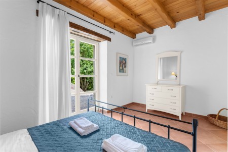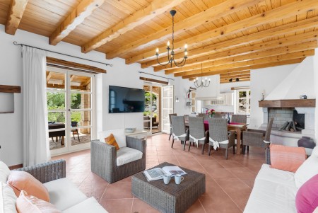 Haus für 8 Personen: ca. 200 m², auf zwei Etagen. Komfortabel eingerichtet, bietet das Haus im Erdgeschoss einen open-space Wohn-/Essbereich mit Klimaanlage, komplett ausgestatteter Küche und Zugang auf die überdachte Terrasse mit Sitzgarnitur und Blick auf den Pool. Des Weiteren, ein Schlafzimmer mit Doppelbett und Klimaanlage, ein Badezimmer mit Dusche und WC sowie ein separates WC. Über eine Treppe gelangen Sie in die erste Etage, wo drei weitere Schlafzimmer auf Sie warten. Zwei davon sind mit Doppelbetten ausgestattet, während das dritte über zwei Einzelbetten verfügt. Alle Schlafzimmer sind klimatisiert, und eines der Zimmer mit Doppelbett hat direkten Zugang zu einem Balkon. Für zusätzlichen Komfort stehen Ihnen auf dieser Etage drei Badezimmer zur Verfügung – eines mit Badewanne und WC sowie zwei weitere mit Dusche und WC.