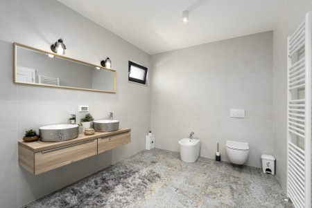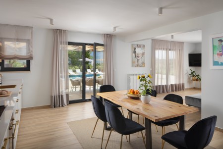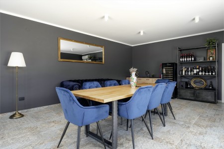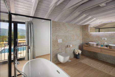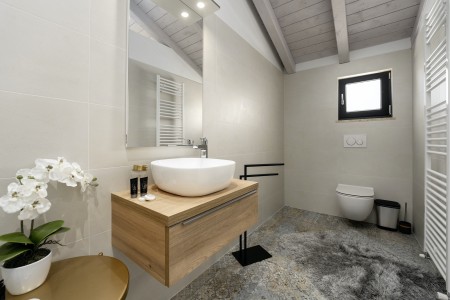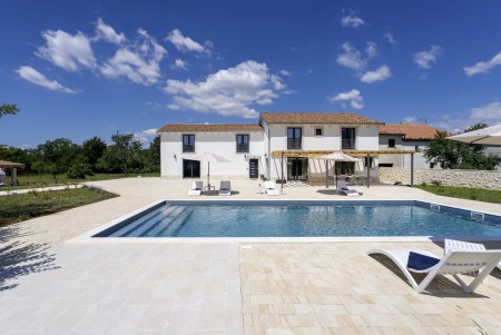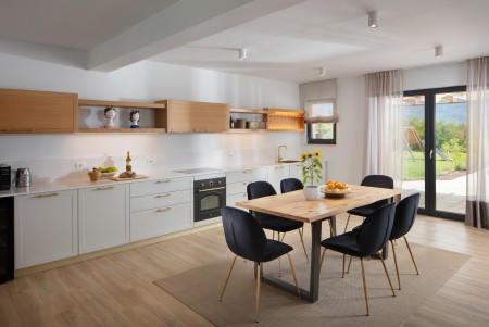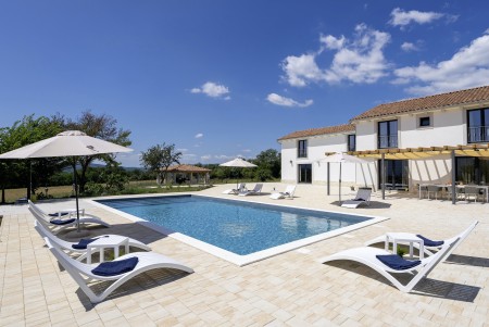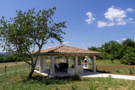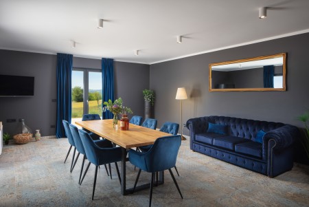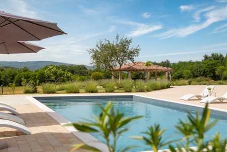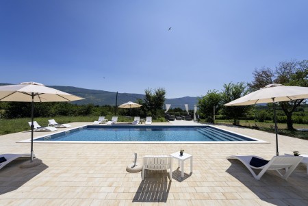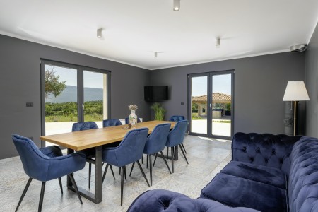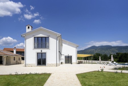 In absolut ruhiger Lage mit einmaligem Panoramablick auf den Berg Učka und die immergrüne, unberührte Natur, befindet sich die die erst kürzlich fertiggestellte Villa auf einem großen Privatgrundstück (8000 m²), das Ihnen komplett zur alleinigen Nutzung zur Verfügung steht. Umgeben von viel Grün und einer einmalig schönen Landschaft mit weitläufigen Feldern, Wiesen und Wäldern, lässt es sich hier wunderbar in Ruhe entspannen. Neben einem privaten Swimmingpool (12 x 8 m) mit Sonnenterrasse, Lounge-Ecke, Außendusche und Liegestühlen bietet der riesige Außenbereich auch einen Grillpavillon mit Essbereich im Freien. Für die kleinen Gäste gibt es zudem einen Spielplatz mit Rutsche und Schaukel. Das Interieur des Hauses ist modern und luxuriös eingerichtet und bietet ein hohes Niveau an Komfort. Die Umgebung eignet sich ideal für ausgedehnte Radtouren und Wanderungen durch die immergrüne Natur, und wer den Berg Učka erklimmt, wird mit einem atemberaubenden Ausblick belohnt. Und auch für einen Badeurlaub sind Sie hier bestens aufgehoben, denn der Strand „Copacabana“, unterhalb des historischen Städtchens Plomin gelegen, ist mit dem Auto in nur 10-15 Minuten erreichbar. Die bekannteren Strände in Rabac sind ca. 23 km entfernt.