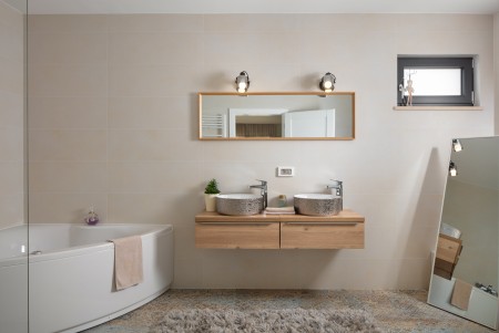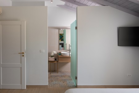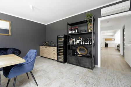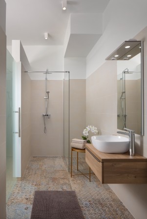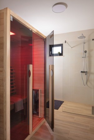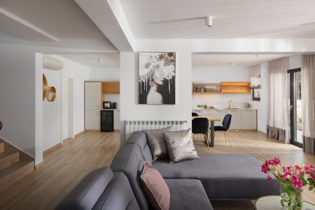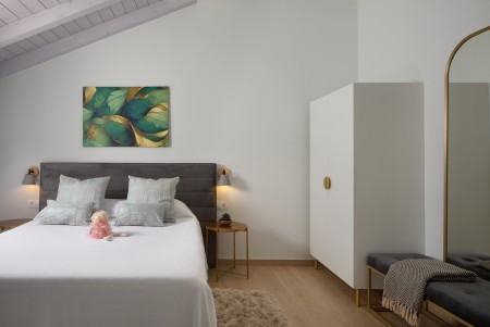 Haus für 8 Personen: ca. 300 m² auf zwei Etagen, geschmackvoll und hochwertig eingerichtet. Im Erdgeschoss befindet sich ein großer open-space Wohnraum mit komfortabler Couch, Klimaanlage, TV, Essbereich und komplett ausgestatteter Küche mit direktem Zugang auf die Terrasse. Des Weiteren bietet das Erdgeschoss ein Lounge-Zimmer mit Klimaanlage, TV, Couch, Esstisch und Weinkühler sowie Teeküche, ein luxuriöses Badezimmer mit Eck-Badewanne, Dusche und WC, ein separates WC und eine Sauna mit Dusche. In der ersten Etage befinden sich zwei Schlafzimmer mit Doppelbett, Klimaanlage, TV und jeweils eigenem Badezimmer mit Dusche und WC, ein weiteres Schlafzimmer mit Doppelbett und Klimaanlage, sowie ein sehr komfortables Master-Schlafzimmer mit Doppelbett, Klimaanlage, TV und stylish integriertem Badezimmer mit zwei Waschbecken, Badewanne und WC.
