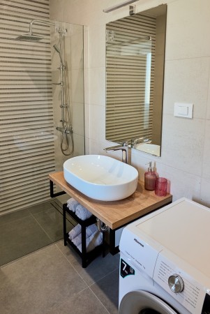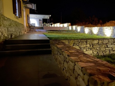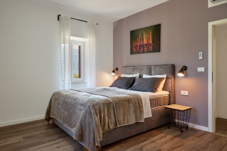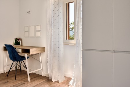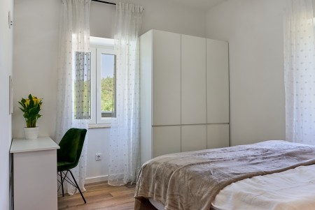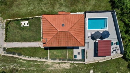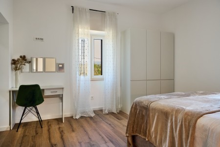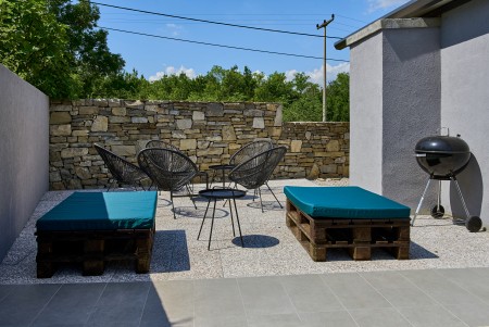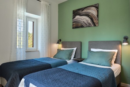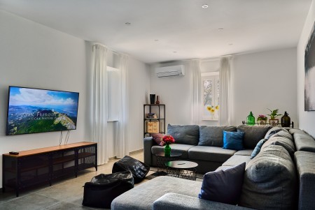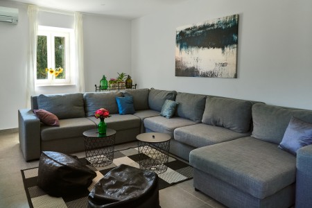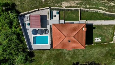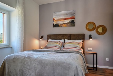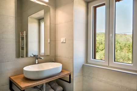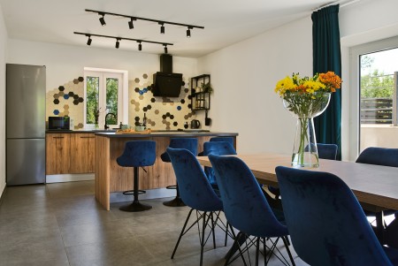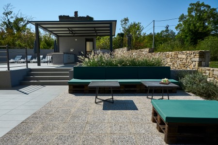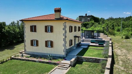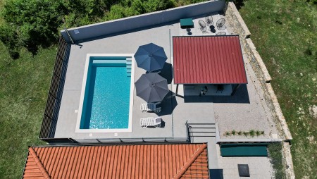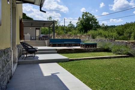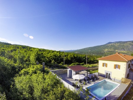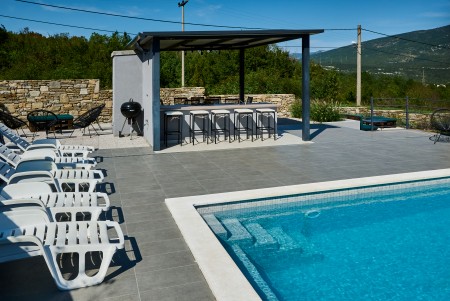 Die freistehende Villa bietet Platz für bis zu zehn Personen und befindet sich in Kostrčani, einem kleinen Dorf in der Nähe der Ostküste der Halbinsel Istrien. Hier genießen Sie nicht nur komplette Privatsphäre, sondern auch einen einmaligen Panoramablick auf die immergrüne Landschaft und den Berg Učka. Die Villa liegt auf einem Privatgrundstück, das Ihnen komplett zur alleinigen Nutzung zur Verfügung steht. Umgeben von viel Grün und einer einmalig schönen Landschaft mit weitläufigen Olivenhainen, Weingärten und Wäldern, lässt es sich hier wunderbar in Ruhe entspannen. Freuen Sie sich auf einen privaten Swimmingpool (7 x 4 m) mit Sonnenterrasse, Außendusche und Liegestühlen. Ein Highlight ist die überdachte Sommerküche am Pool mit Kühlschrank, Herd, Waschbecken und Tresen mit Barhockern, sodass stets kühle Getränke griffbereit sind und man spontan auch einen kleinen Snack im Freien zubereiten kann. Das Interieur des Hauses ist modern eingerichtet und mit allen Annehmlichkeiten für einen erholsamen und komfortablen Aufenthalt ausgestattet. Die Umgebung eignet sich ideal für ausgedehnte Radtouren und Wanderungen durch die immergrüne Natur, und wer den Berg Učka erklimmt wird mit einem atemberaubenden Ausblick belohnt. Und auch für einen Badeurlaub sind Sie hier bestens aufgehoben, denn der Strand „Copacabana“, unterhalb des historischen Städtchens Plomin gelegen, ist mit dem Auto in nur 15 Minuten erreichbar. Die bekannteren Strände in Rabac sind ca. 25 km entfernt.