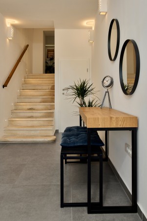 Haus für 8-10 Personen: ca. 150 m² auf zwei Etagen. Im Erdgeschoss befinden sich eine moderne, komplett ausgestattete Küche mit Essbereich und SAT-TV, ein geschmackvoll eingerichtetes Wohnzimmer mit Schlafcouch (160 x 200 cm) und Klimaanlage sowie ein Badezimmer mit Dusche und WC. Die erste Etage bietet drei komfortable Schlafzimmer mit Doppelbett, ein Schlafzimmer mit zwei Einzelbetten und drei Badezimmer mit Dusche und WC. Alle Schlafzimmer sind mit Klimaanlage ausgestattet.