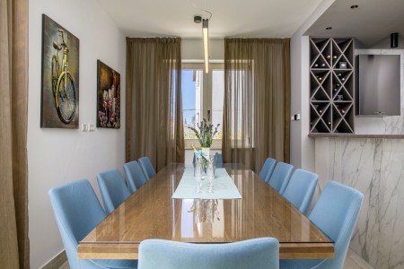 Haus für 8-9 Personen: ca. 230 m² auf zwei Etagen. Im Erdgeschoss befindet sich eine moderne, komplett ausgestattete Wohnküche mit Esstisch, Kamin, Klimaanlage, TV und Ausblick auf den Pool. Des Weiteren bietet das Erdgeschoss einen hellen Wohnraum mit bequemer Couchgarnitur (ausziehbar als Schlafcouch 160 x 200 cm), TV, Klimaanlage, Esstisch und einer weiteren komplett ausgestatteten Küche. Außerdem, ein Schlafzimmer mit Doppelbett und ein Badezimmer mit Dusche und WC. Die erste Etage bietet drei komfortable Schlafzimmer mit Doppelbett, zwei Badezimmer mit Dusche und WC sowie ein Badezimmer mit Badewanne und WC. Jedes Schlafzimmer hat einen eigenen Fernseher und Klimaanlage. Zwei Schlafzimmer teilen sich einen großen Balkon mit herrlichem Blick ins Grüne und auf das in der Ferne glitzernde Meer, ein Schlafzimmer hat einen eigenen großen Balkon. Darüber hinaus gibt es in der ersten Etage einen Waschraum mit Waschmaschine und Trockner.
