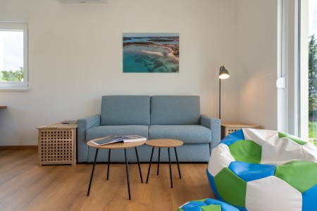 Haus für 2-4 Personen: ca. 60 m², ebenerdig. Im größeren der Räume befindet sich eine komplett ausgestattete Küche mit Essbereich und Wohnzimmer mit ausziehbarer Couch für 2 Personen (140 x 200 cm), Klimaanlage und Zugang zur Terrasse. Außerdem gibt es ein Schlafzimmer mit Doppelbett, SAT-TV und Klimaanlage sowie ein Badezimmer mit Dusche und WC.