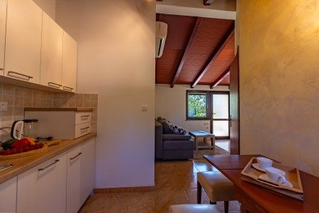 Haus für 2-4 Personen: ca. 40 m², ebenerdig. Modern eingerichtet bietet das Haus einen Wohn-/Essbereich mit Klimaanlage, ausziehbarer Couch (140 x 190 cm), Küche und direktem Zugang auf die Terrasse. Des Weiteren, ein Schlafzimmer mit Doppelbett und Klimaanlage, sowie ein Badezimmer mit Dusche und WC.