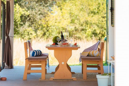 Sonstiges: WiFi-Internet kostenlos verfügbar. Überdachte Terrasse mit Tisch und Bänken, Liegestühle, Sonnenschirm und Grill stehen Ihnen im teilweisen eingezäunten Garten zur Verfügung. Kostenloser Privatparkplatz auf dem Grundstück. Die Küche ist mit Wasserkocher und Toaster ausgestattet. Die Versorgung mit Wasser erfolgt durch einen eigenen Brunnen. Dieses Wasser ist zum Kochen und Duschen geeignet, Trinkwasser sollten Sie kaufen/mitbringen. Zwei Fahrräder für Erwachsene stehen Ihnen zur kostenlosen Nutzung zur Verfügung. Die letzten 80 m zum Haus führen über eine nicht-asphaltierte Straße.