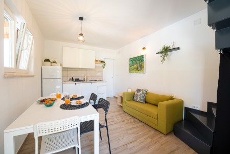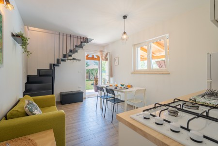 Haus für 2-3 Personen: ca. 43 m², auf zwei Etagen. Im Erdgeschoss befindet sich ein Wohn-Essbereich mit Küche, Couch und Klimaanlage sowie ein Badezimmer mit Dusche und WC. Vom Wohnbereich führt eine Treppe in die obere Etage, wo sich der Schlafbereich mit Doppelbett, Schlafsofa (150 x 190 cm), Klimaanlage und TV befindet.