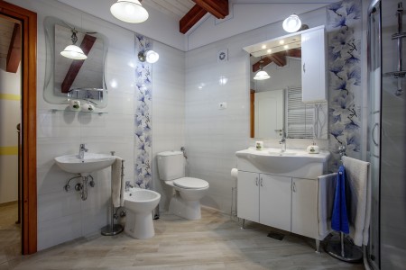 Haus für 4-5 Personen: ca. 100 m² auf zwei Etagen. Im Erdgeschoss befindet sich ein Schlafzimmer mit Doppelbett und Klimaanlage, ein Badezimmer mit Dusche und WC, ein gemütliches Wohnzimmer mit Klimaanlage, eine komplett ausgestattete Küche mit Essbereich, Terrasse und ein separates WC. Die erste Etage bietet ein Schlafzimmer mit Klimaanlage und zwei Einzelbetten sowie Schlafsofa (80 x 190 cm) und ein Badezimmer mit Dusche und WC.