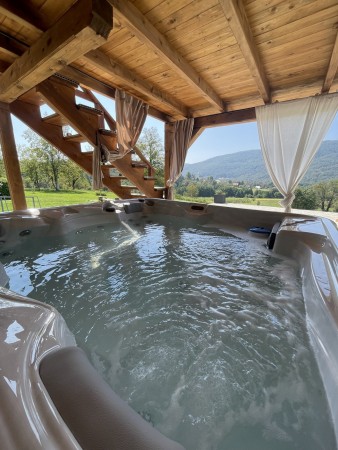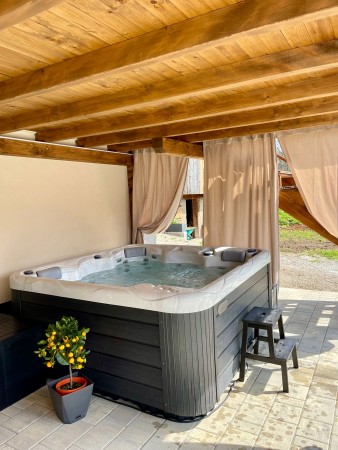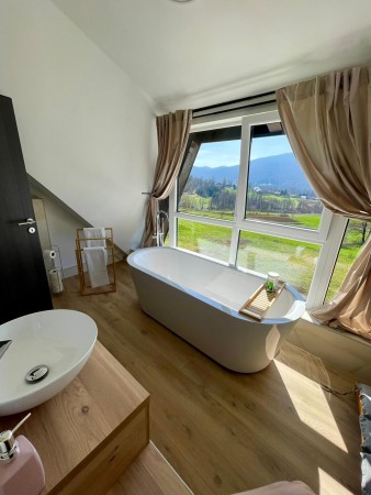 Sonstiges: WiFi-Internet kostenlos verfügbar. Kostenloser Privatparkplatz für 5 PKW auf dem Grundstück. Vom Souterrain gelangen Sie auf die überdachte Terrasse mit Whirlpool – der perfekte Ort, um in warmem Wasser zu entspannen und den Alltag hinter sich zu lassen. Gleich daneben befindet sich ein Grillbereich, ideal für gemütliche Abende mit köstlichen Mahlzeiten. Das Erdgeschoss und das Souterrain sind nicht durch eine Innentreppe verbunden, sondern nur über eine Außentreppe zugänglich. Im Garten lädt die Sonnenterrasse mit Liegestühlen zum Verweilen ein, während Sie den Blick auf die grüne Umgebung genießen.