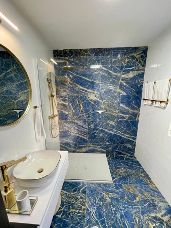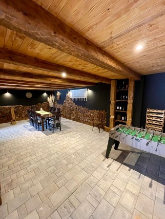 Haus für 8-10 Personen: ca. 200 m², bestehend aus Souterrain, Erdgeschoss und erster Etage. Im Souterrain befindet sich ein Mehrzweckraum mit komplett ausgestatteter Küche, Esstisch mit Stühlen, Tischfußball und Sauna sowie ein Badezimmer mit Dusche und WC. Das Erdgeschoss umfasst eine komplett ausgestattete Küche mit Ess-/Wohnbereich, ausziehbarer Couch (140 x 200 cm), Klimaanlage und direktem Zugang auf die große Terrasse (45 m²) mit Blick ins Grüne. Außerdem gibt es ein Schlafzimmer mit Doppelbett, SAT-TV und Klimaanlage, ein Badezimmer mit Dusche und WC sowie eine Waschküche mit Waschmaschine und Wäschetrockner. In der ersten Etage befinden sich zwei Schlafzimmer, die jeweils mit einem Doppelbett, einem Einzelbett, SAT-TV und Klimaanlage ausgestattet sind. Zudem gibt es auf dieser Etage ein Badezimmer mit Badewanne und Dusche.